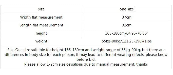Size:One size suitable for height 165-180cm and weight range of 55kg-90kg Please allow 1-2cm size deviations due to manual measurement, thanks |